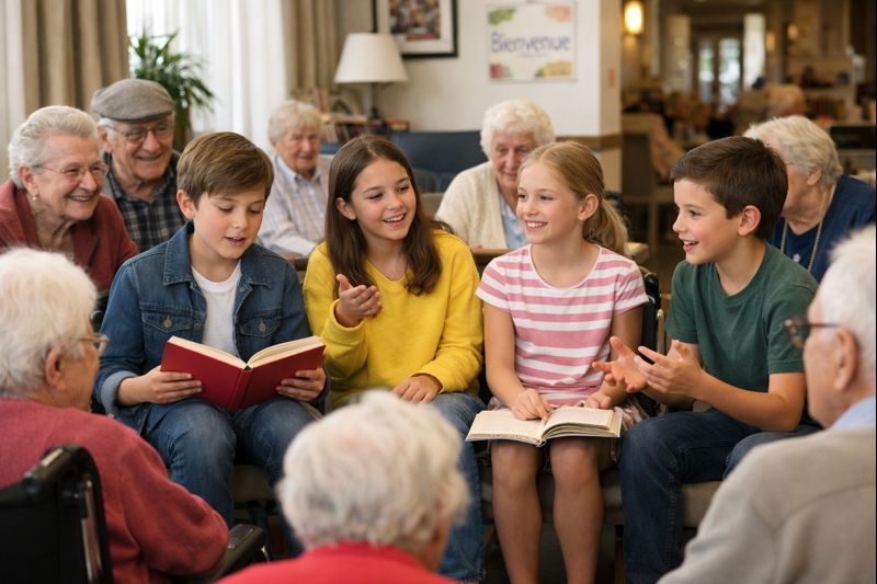 Dans ce cadre, des enfants (scolaires, centres de loisirs, jeunes participants) peuvent se rendre au sein d’un Ehpad ou d’une structure accueillant des personnes âgées afin de partager différents temps d’échange :